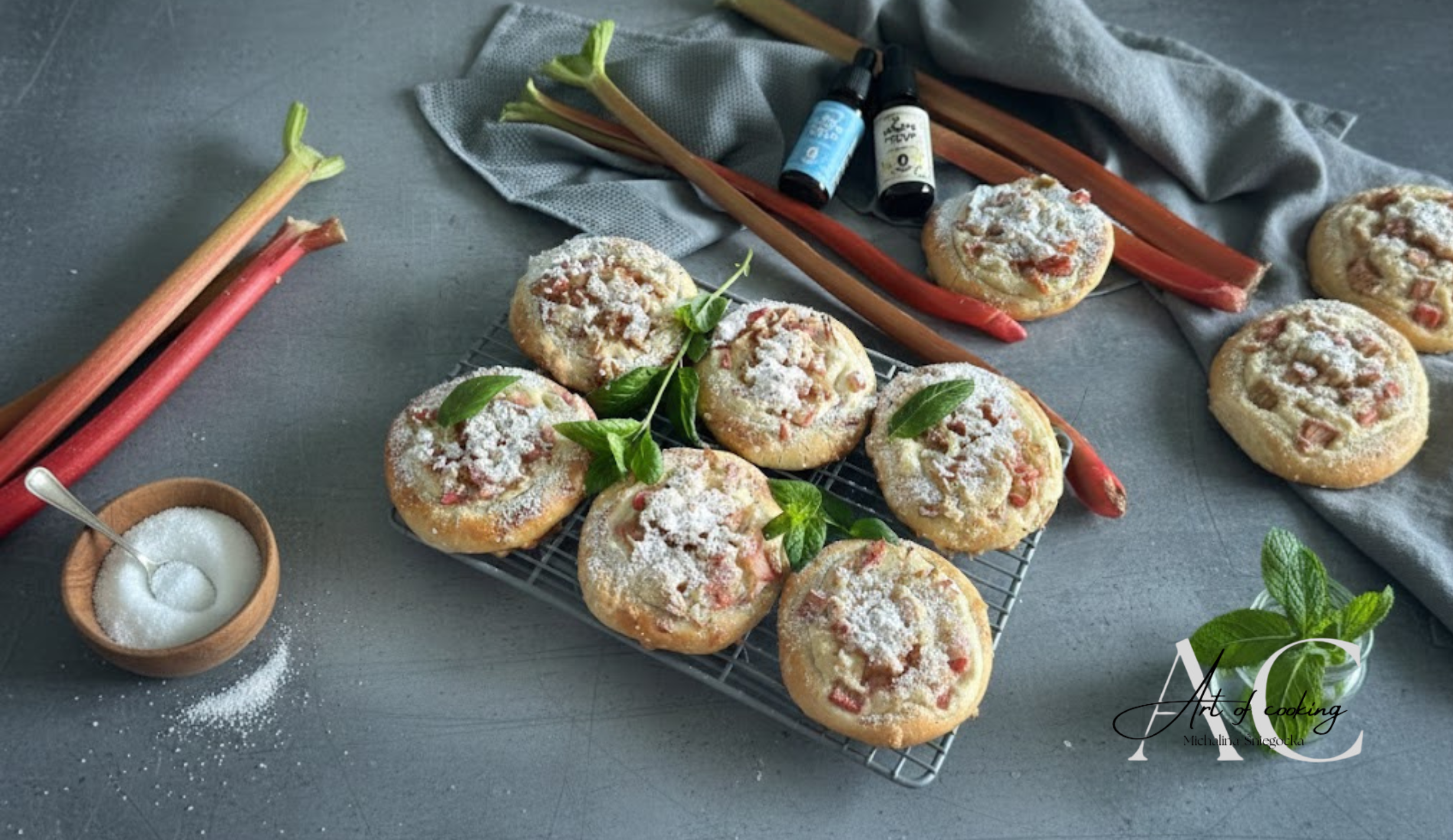 Rabarbar drobno posiekaj i ułóż na sicie do odsączenia. Następnie ułóż na każdej drożdżówce.