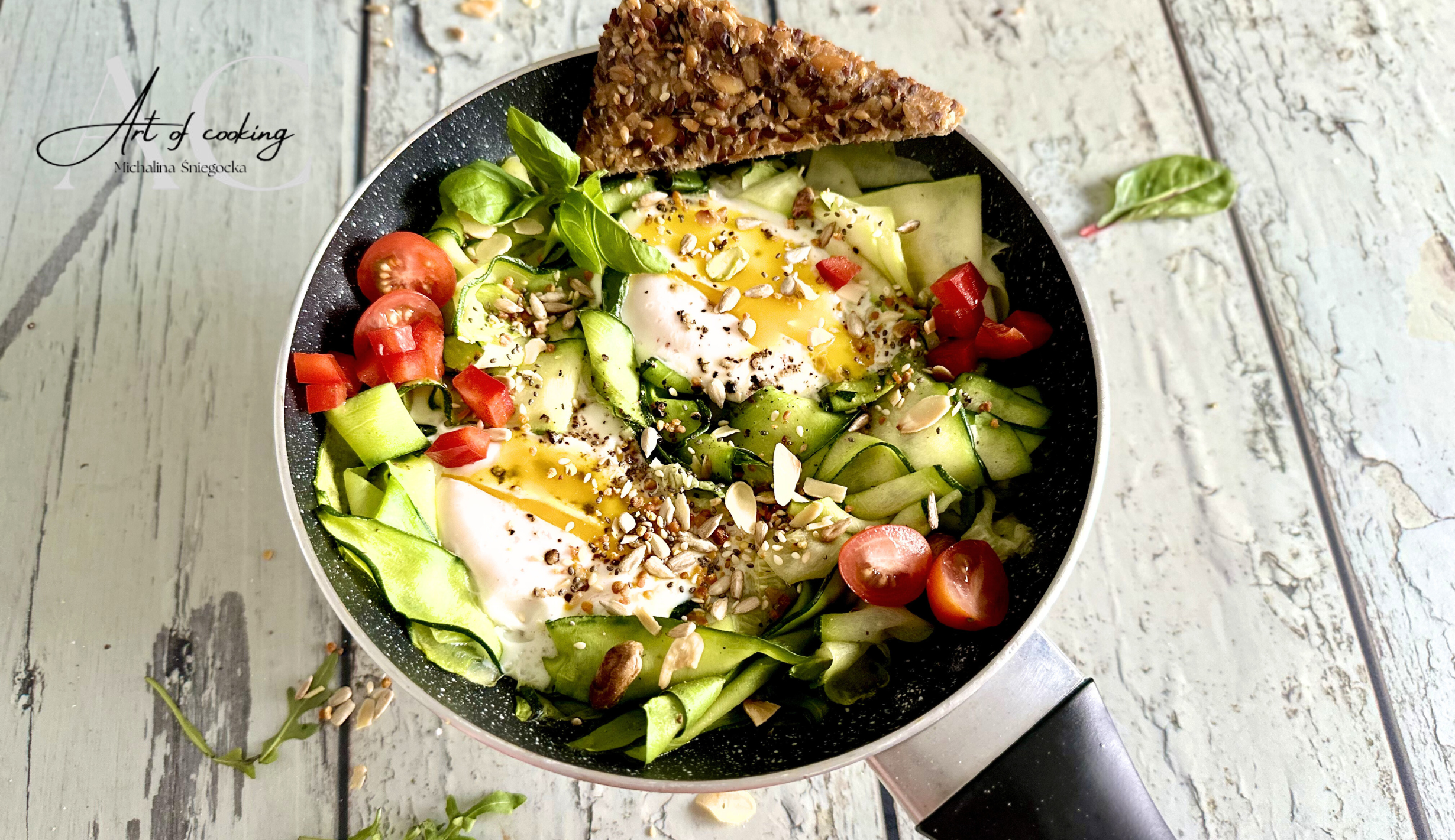 Dopraw solą i pieprzem i smaż chwilę, delikatnie mieszając. Gdy cukinia będzie już miękka, zrób dwa zgłębienia „gniazda” i wbij w nie jajka.