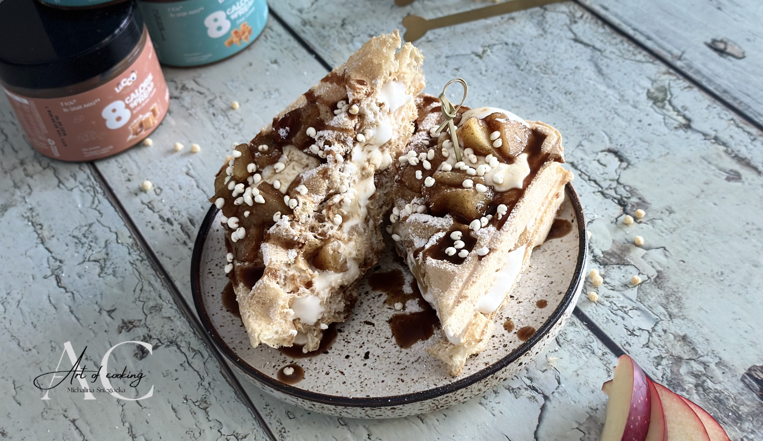 Na talerz ułóż jednego gofra. Rozsmaruj na nim 3/4 fit śmietanki i ułóż część jabłek. Przykryj drugim gofrem, wyłóż resztę fit Śmietanki oraz jabłek i polej kremem karmelowym Locco.