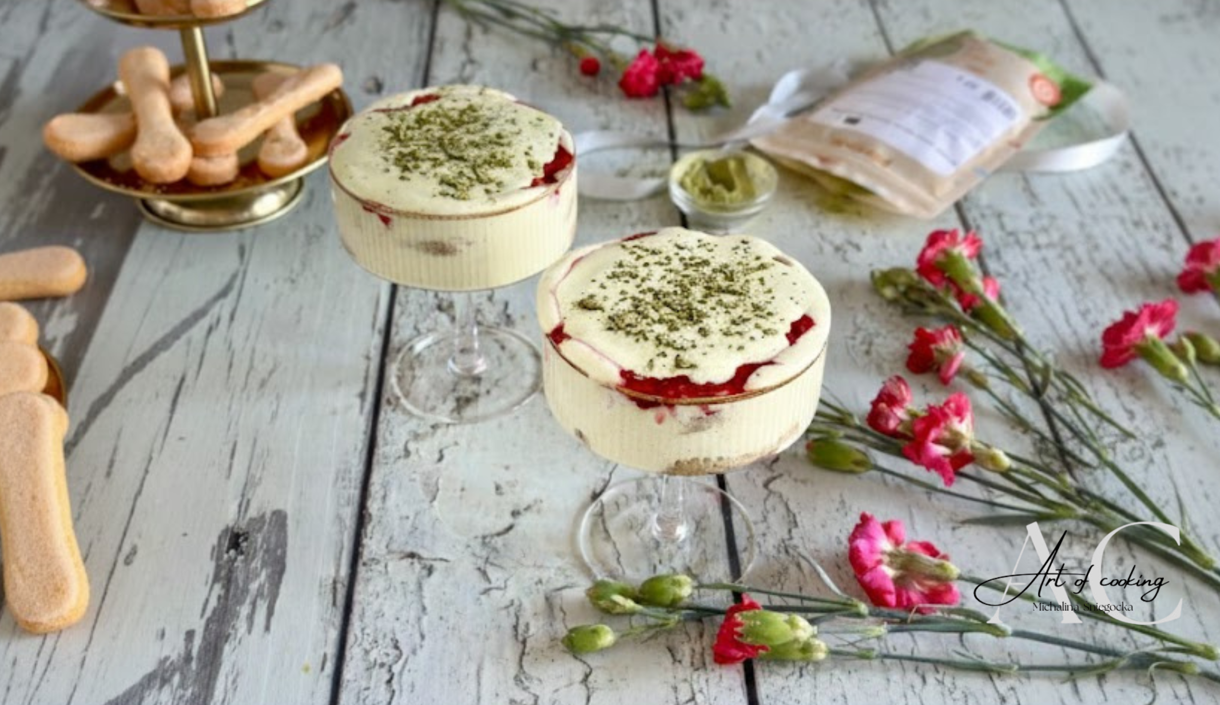 Połowę biszkoptów maczaj w matchy i układaj na spodzie naczyń.