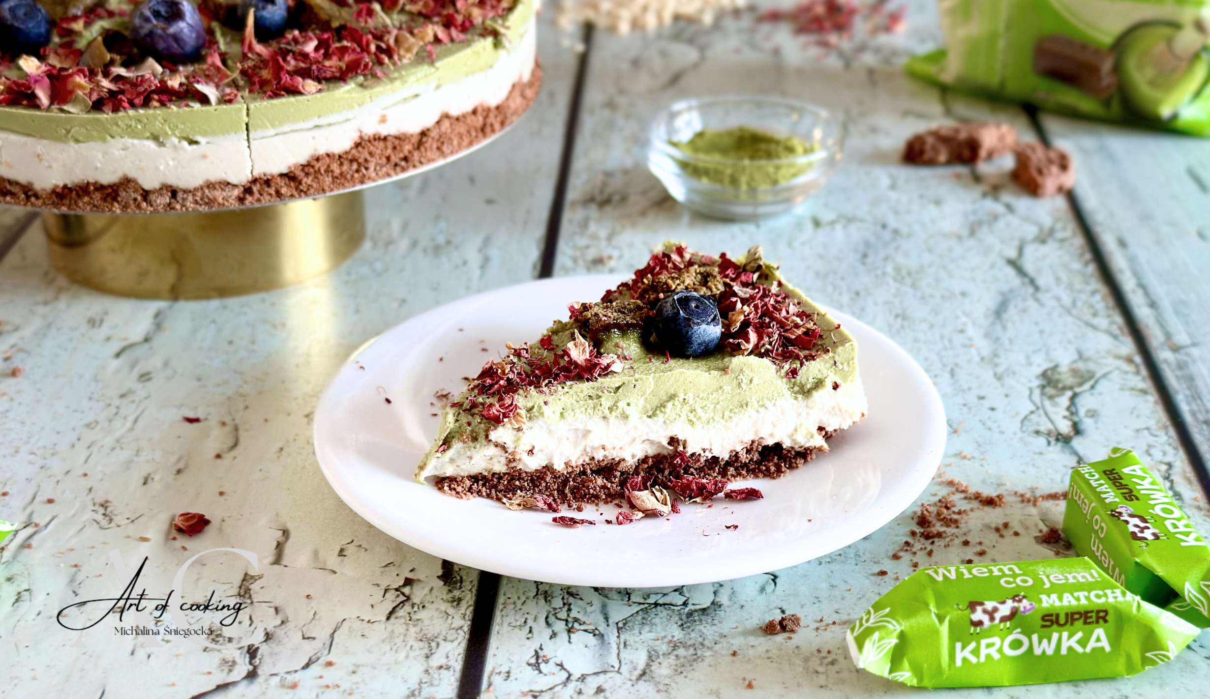 Ozdób płatkami róży, borówkami i pokrojonymi krówkami z matchą.