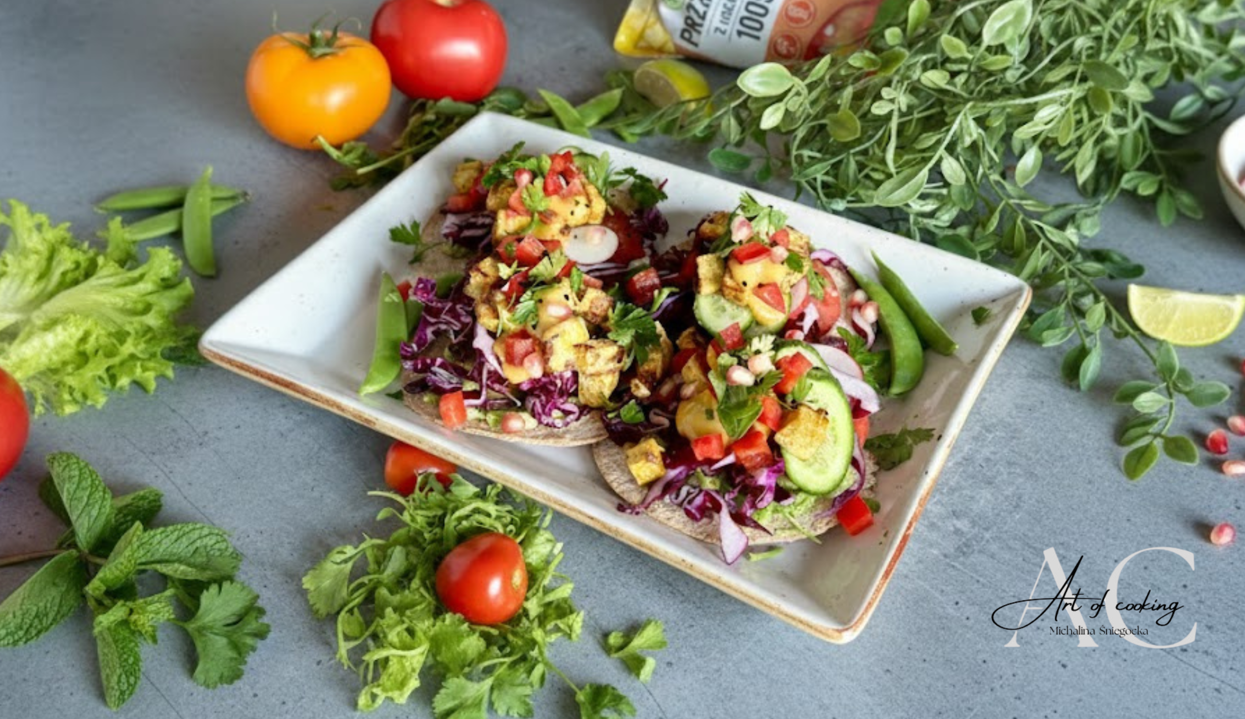Na przygotowane placki nałóż awokado oraz warzywa, tofu i sosik mango-chilli.